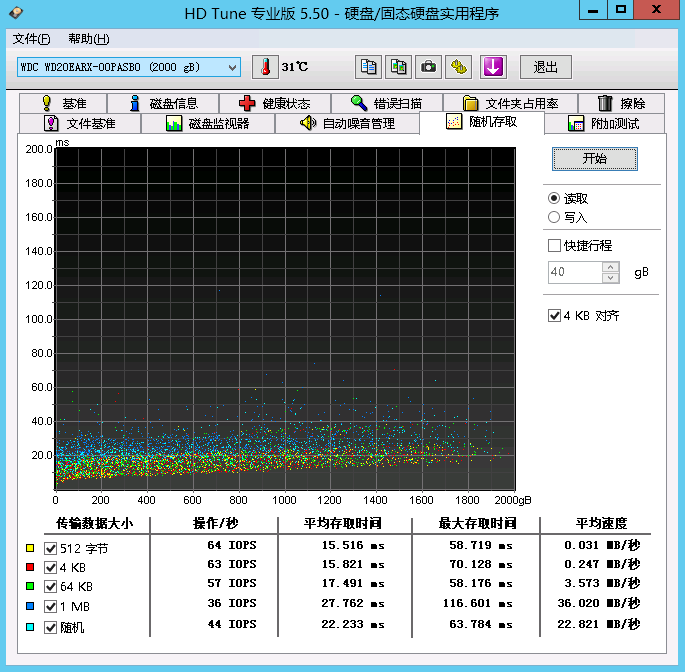 在网站WEB应用及数据库应用中,通常是若干随机小文件的读写,故存储的IOPS若太低则在高访问量的情况下可能会成为性能瓶颈。 用“HD Tune专业版5.50”中的“文件基准”功能可以测试