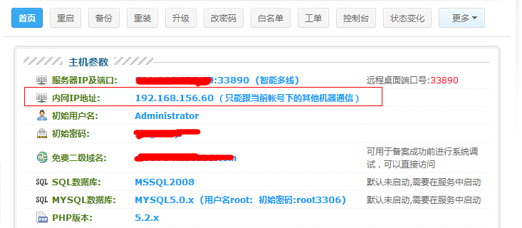 相同账号下的每个弹性云服务器都分配有一个内部IP用于跟当前帐号下的其他机器通信,例如要将A主机下
