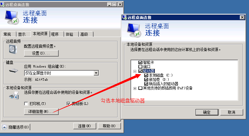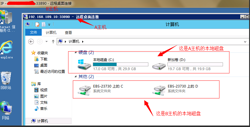 进行登录,进入A主机远程桌面后就可以看到B主机的本地磁盘,数据就可以两个主机磁盘之间直接进行拷贝: