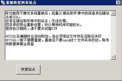 3、点击提示对话框,会自动打开“网站管理助手”,点击“系统设置”--“重装恢复”,系统会自动重建用户账户、IIS站点、FTP和mysql。重建成功后会有相应提示。