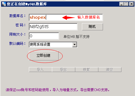 2.输入mysql数据库名,如果已经创建过该数据库名,请换一个未使用过的。密码为了保证复杂性,可以使用系统自动生成的密码,不做修改,默认编码不做修改。然后点“立即创建”。