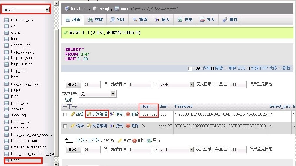 方法①、可以用phpmyadmin连接登陆mysql,选择mysql数据库,打开user表,选择您需要开启远程连接的用户,点快速编辑,将host列里面的值修改为%就可以完成。