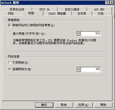 也可以在IIS的站点属性中,对带宽和连接数进行限制,来达到缓解访问量大导致CPU耗尽的问题(访问量大最根本的解决方法就是升级到资源更多的云主机或者独立服务器),如图: