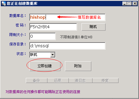 2.输入mssql数据库名,不可与已创建的其他数据库重名,密码为了保证复杂性,可以使用系统自动生成的密码,不做修改。然后点“立即创建”即可。