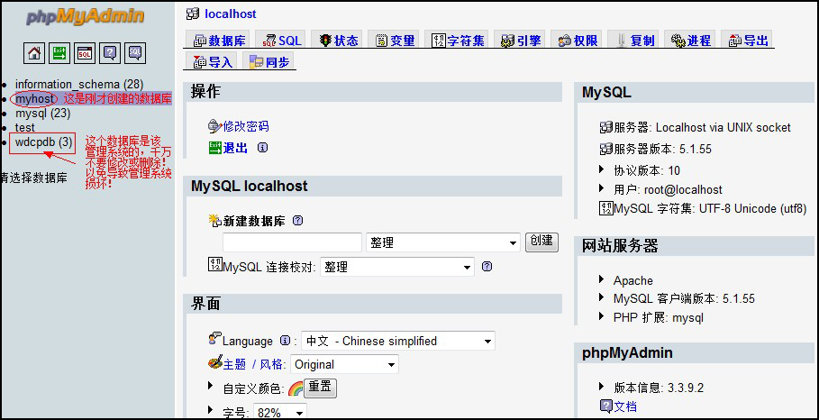 注意:wdcpdb这个数据库不要修改和删除,误操作将会导致wdcp管理系统损坏!!如图: