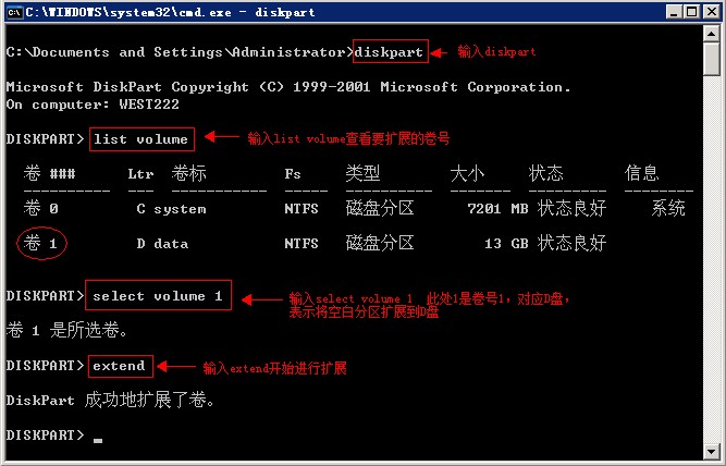 select volume 1 回车(1在这里表示D盘)