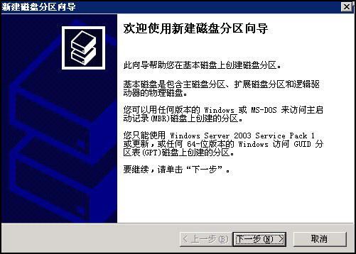 在“新建磁盘分区向导”点击下一步,如图: