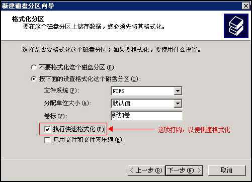 格式化分区,保持NTFS文件系统,并勾选“执行快速格式化”。如图:
