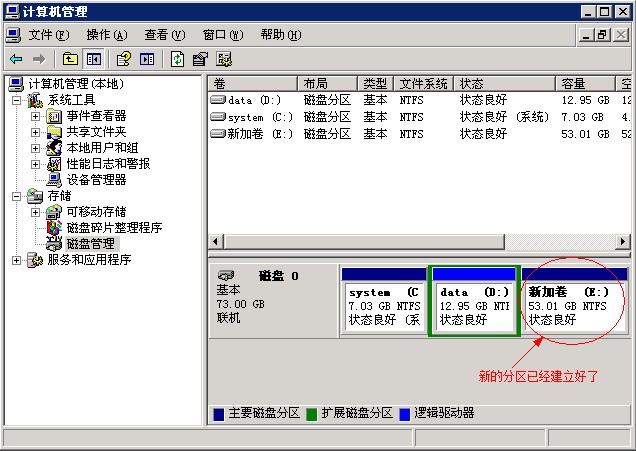 在磁盘管理中即可看到建立好的新分区,如图: