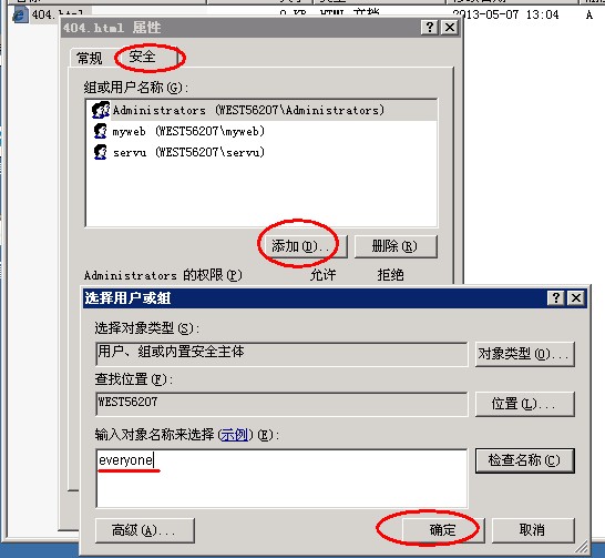 然后给404文件everyone可读权限,右键404文件--属性--安全,添加everyone可读,如图所示: