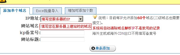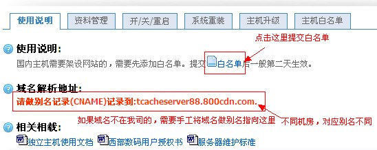 可以点击“白名单”,来提交您的刚刚在服务器上建站时填写的域名,另外,如果域名不在我司的,就需要将域名做别名指向下图中的“域名解析地址”。(不同线路和不同型号的产品,解析地址有所区别,请以您的主机租用管理界面显示为准,如没显示域名解析地址,请将域名解析到服务器IP)