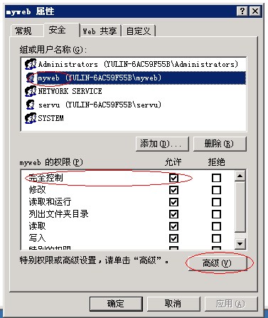 选择建立网站时输入的FTP账号对应的用户,如myweb。在权限中选择“完全控制”,然后点“高级”。