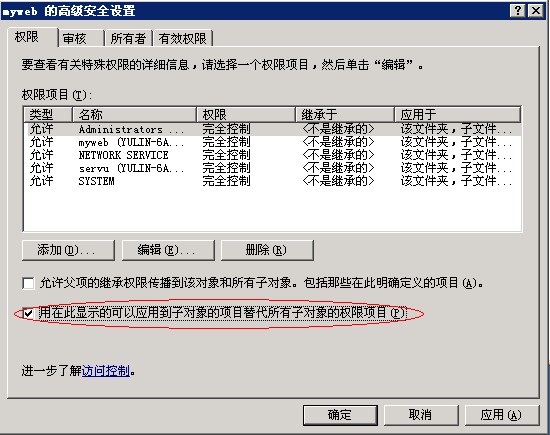 勾选“用在此显示的可以应用到子对象的项目替代所有子对象的权限项目”,然后点“确定”。