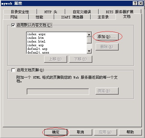 在IIS中找到相应站点,点右键“属性”,然后选择“文档”,检查默认文档列表中是否有您的默认首页文件名,如没有请点击“添加”增加相应的文件名,建议将默认文档上移至第一个位置。然后点击确定。