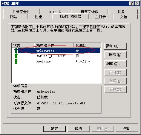 如果部分网站需要静态化,请在该网站属性中的“ISAPI筛选器”中点击“添加”,选择D:\WEST263_PHP_PACKAGE\rewrite 里的 ISAPI_Rewrite.dll文件,点添加,然后重启IIS即可。