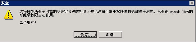 在弹出的“安全”对话框中,点“是”,即可开始附加权限,附加完成后,即可恢复网站访问。(注:如果是手工建立的站点,而非管理助手建立的站点,此方法不一定有效,建议删除后用管理助手建站。)