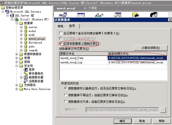 4、点击确定后,点还原数据库上的“选项”查看恢复后数据库的路径,有时可能会还原失败,可以勾选“在现有数据库上强制还原”,至此,数据库还原的过程就讲完了。如图: