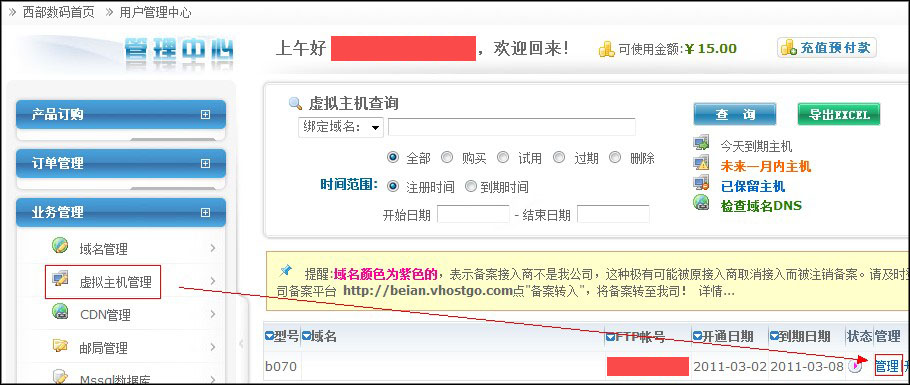 首先打开我司网站www.pu263.com,输入用户名和密码,进入管理中心,点击左侧的业务管理—虚拟主机管理,登陆到虚拟主机管理面板,如图:
