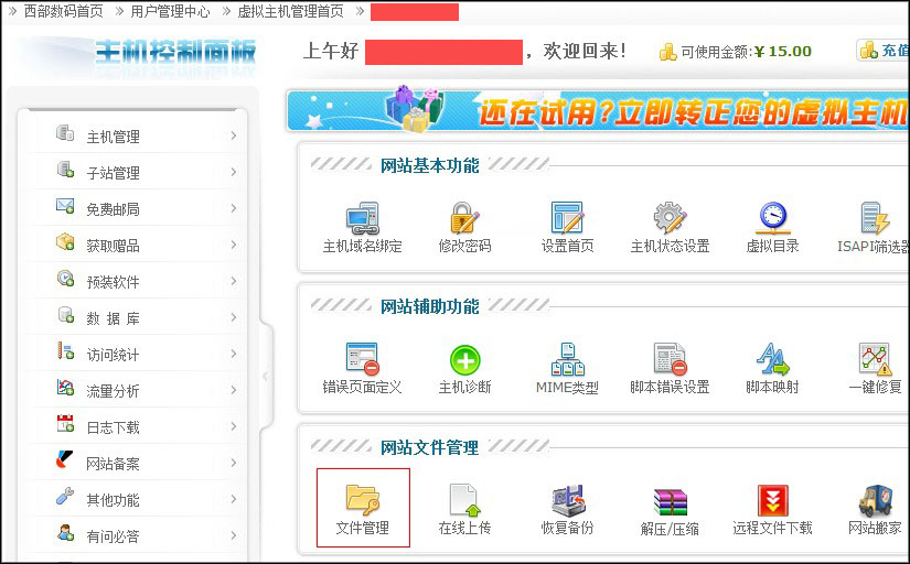 在虚拟主机管理面板,点击“文件管理”,如图: