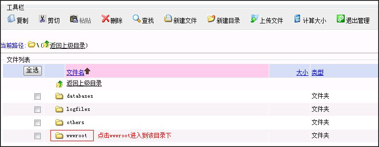 在文件管理器中点击wwwroot,进入网站根目录(wwwroot目录),如图: