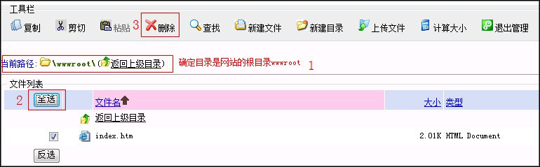 确定当前路径在wwwroot下,点击全选,选择所有文件,然后点击最上边的“删除”可以很快清空您的站点,对于网站内容较多的站点是最省时的方法,数据清空后将无法再找回,此操作时请谨慎!如图: