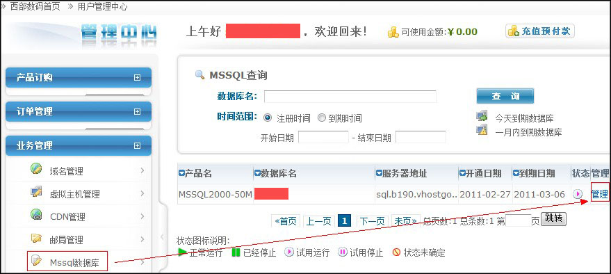 首先打开我司网站www.west263.com,输入用户名和密码,进入管理中心,点击左侧的业务管理—mssql数据库,登陆到mssql数据库管理面板,如图: