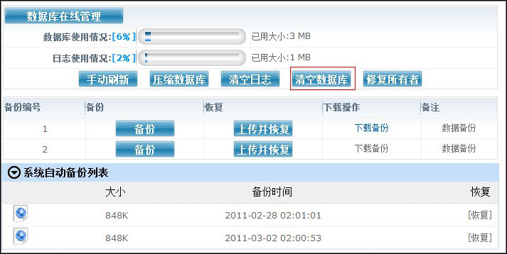 在数据库管理面板中,点击“清空数据库”,将会清空您现在mssql数据库的所有表和存储过程,数据清空后将无法再找回,请谨慎操作!如图: