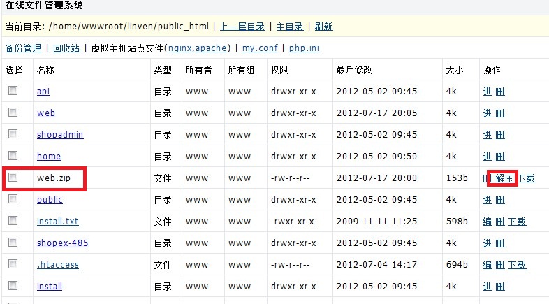 进入默认会看到public_html目录,点进去以后就可以看到空间里面的文件,对应的压缩包会看到解压按钮,点击解压即可,系统会把文件解压到当前目录