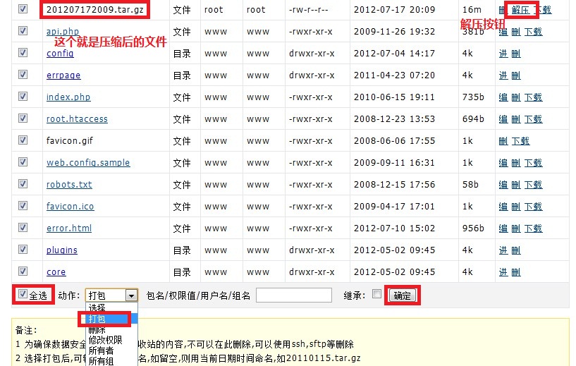 压缩文件同样是要先进入到文件管理打开网站目录,可以根据实际需要选择文件,或者点击文件列表下方的全选按钮,动作选择打包,点击确认即可,系统会执行压缩命令,并且以当前时间命名文件,如图所示: