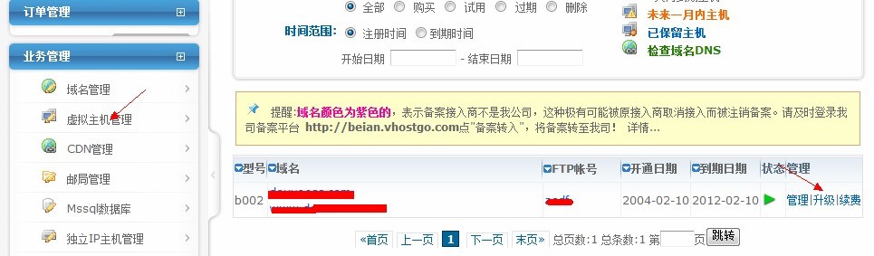 1.登录【管理中心】-【业务管理】-【虚拟主机管理】