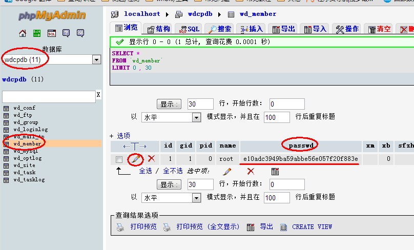 然后按上述图二所示,在线编辑wdcpdb.wd_sys表,修改adm_pass字段的密码