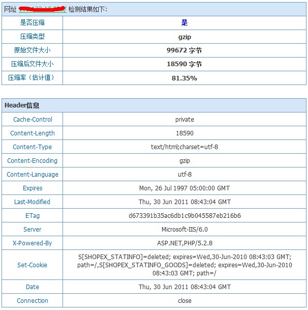 特别提示若您的网站启用了CDN技术(我司的共享IP方案中西部数码双线机房、港台机房均使用了CDN技术),则请勿开启gzip功能,否则会导致用户端访问为空白的情况,设置好后,可以通过http://tool.chinaz.com/Gzips/ 来测试压缩结果,如图:
