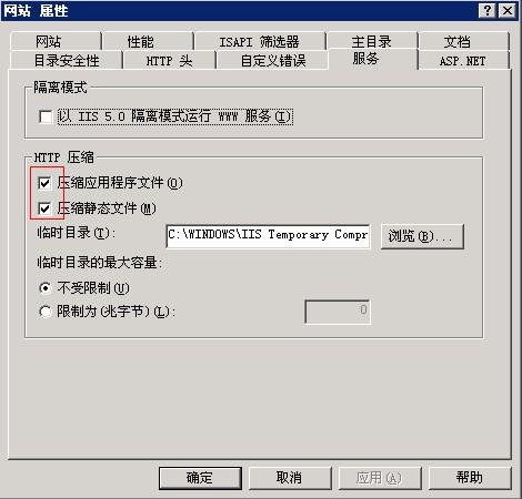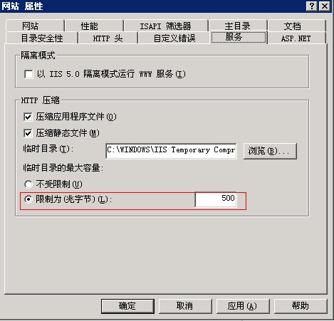 压缩后的缓存文件会存放在C:\WINDOWS\IIS Temporary Compressed Files 因此建议在IIS--网站--属性--服务,设置一个大小,避免C盘被占满了。如图: