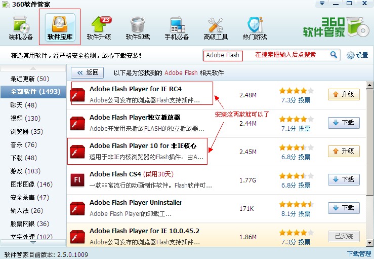 打开360安全卫士,点击“软件管家”,然后点击“软件宝库”,搜索Adobe Flash,然后按照以下图示,选择安装,安装好以后,重新打开浏览器就可以正常使用了。