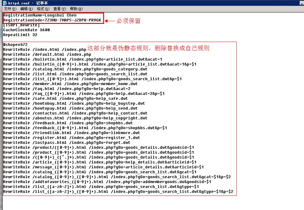 2、开启以后,用记事本打开编辑修改网站目录others里面的httpd.conf,这里以站点名为test举例,文件路径就是D:\wwwroot\test\others,注意httpd.conf里面顶部两行不能替换,规则替换为自己的即可。